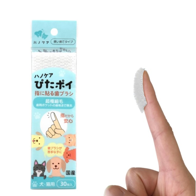 ワンちゃん口内のお掃除に! やわらか~い指に貼る使い捨て歯ブラシ ◎ 指にぴたっと貼りつくので、指サックや歯ブラシと違い、飼い主様の指の感覚で歯の裏側や奥歯までしっかり歯磨きできます。飼い主様の指なので愛犬、愛猫も安心でリラックスしてケアできます。 ◾️歯と歯周のわずかな汚れもヌメリも除去 直毛で超極細の繊維のため、オクチの中の細かい凸凹や、 歯周ポケットの奥まで入り込み、細かい汚れや、ヌメリ、 雑菌を取り除きます。 ・通常歯ブラシの約10倍の密度で、洗浄効果も抜群! ユニークな「特許繊維」を使用しています ・繊維の植毛が高密度(1711本/C㎡) ・超極細の直毛繊維素材(45/1000mm) ・とてもやわらかな繊維で、オクチの中を傷つけにくく 歯茎のマッサージにも最適です。 注意事項: 繊維が付着している場合がありますので、指に貼り、水で繊維を落としてからご使用ください。指が濡れた状態や、ハンドクリーム等がついていると剥がれやすくなります。 その他: シートから1枚剥がして指に貼ってください 水で軽く洗い流し、付着した繊維を落としてください 歯と歯茎をマッサージしながら磨いてください 使用後はゴミとして処分してください 入り数:30枚 生産地:日本 サイズ:55×185×10mm 素材:ポリエステル メーカー:KPS(ケーピーエス) 【メール便:OK】
