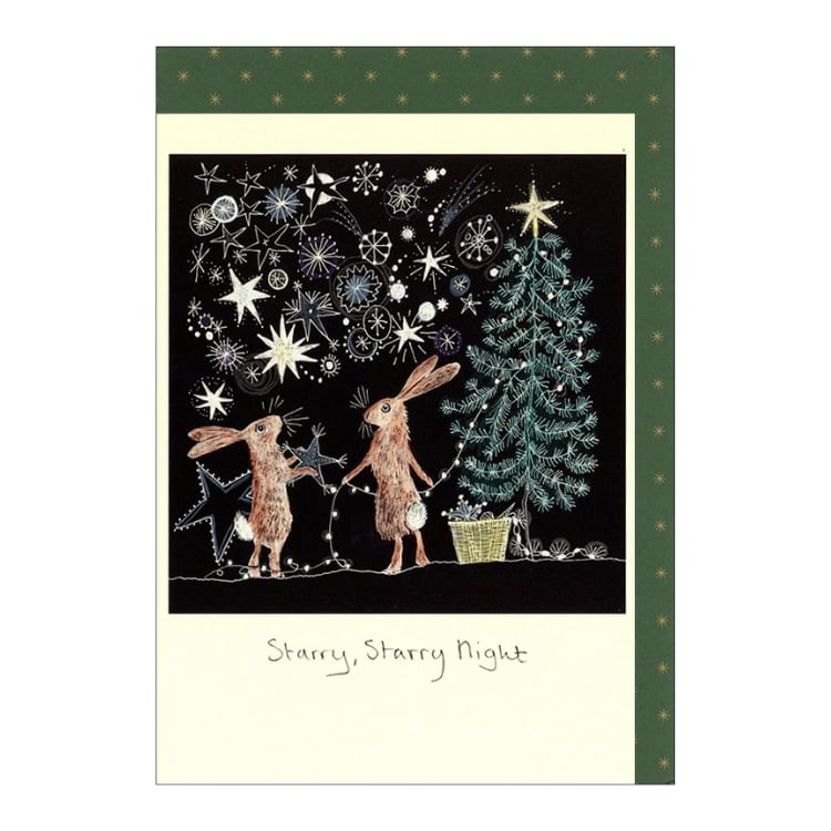 「夜のツリーの飾り付けをするうさぎ」2025新作 クリスマスカード 英国製 TWO BAD MICE