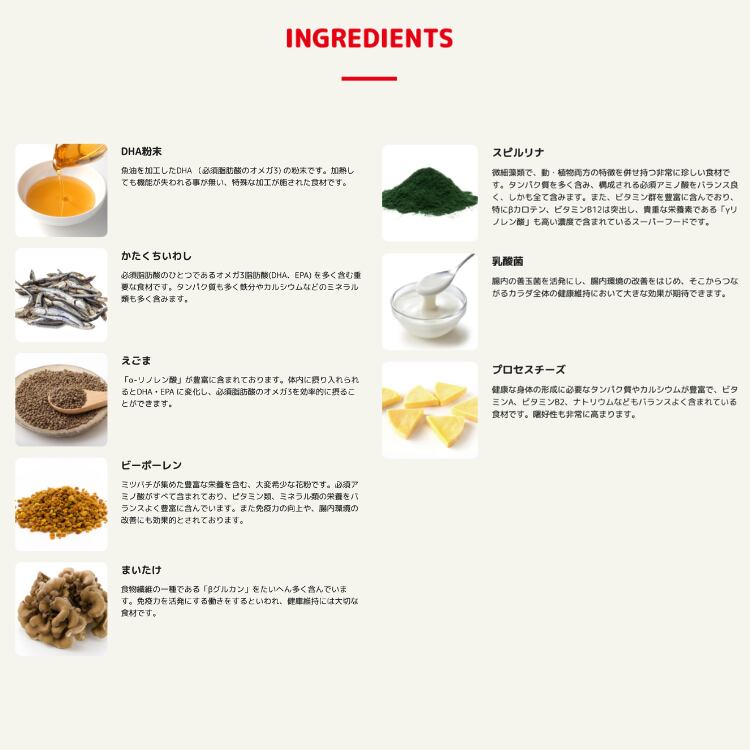 大麦、きゃべつ、にんじん、かぼちゃ、ホワイトソルガム、さつまいも、かたくちいわし、大豆、プロセスチーズ、ビーツ、DHA 粉末、えごま、乳酸菌、まいたけ、ブロッコリー 、スピルリナ、ビーポーレン