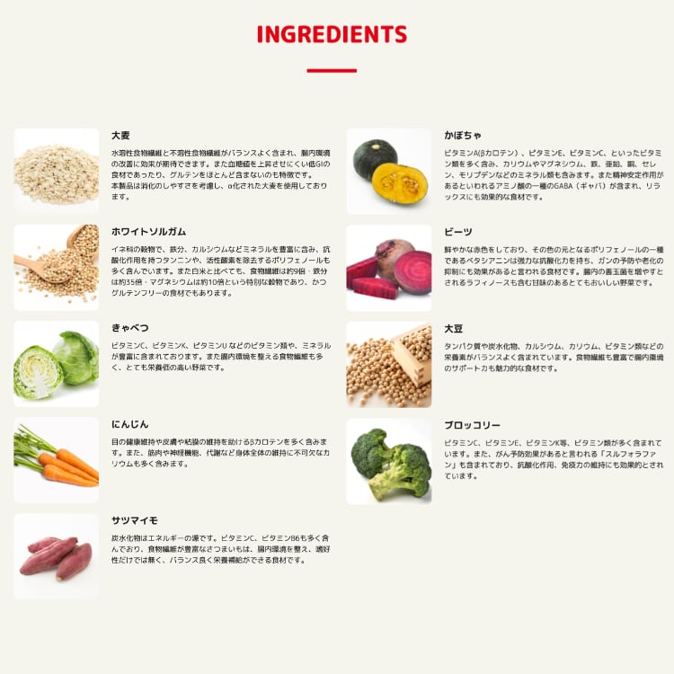 大麦、きゃべつ、にんじん、かぼちゃ、ホワイトソルガム、さつまいも、かたくちいわし、大豆、プロセスチーズ、ビーツ、DHA 粉末、えごま、乳酸菌、まいたけ、ブロッコリー 、スピルリナ、ビーポーレン