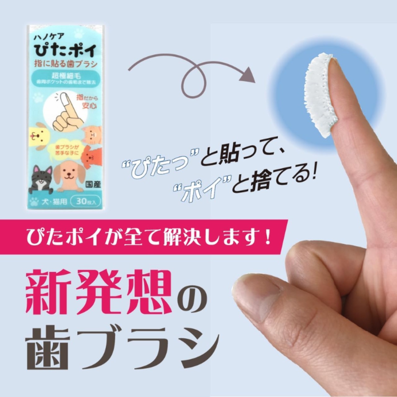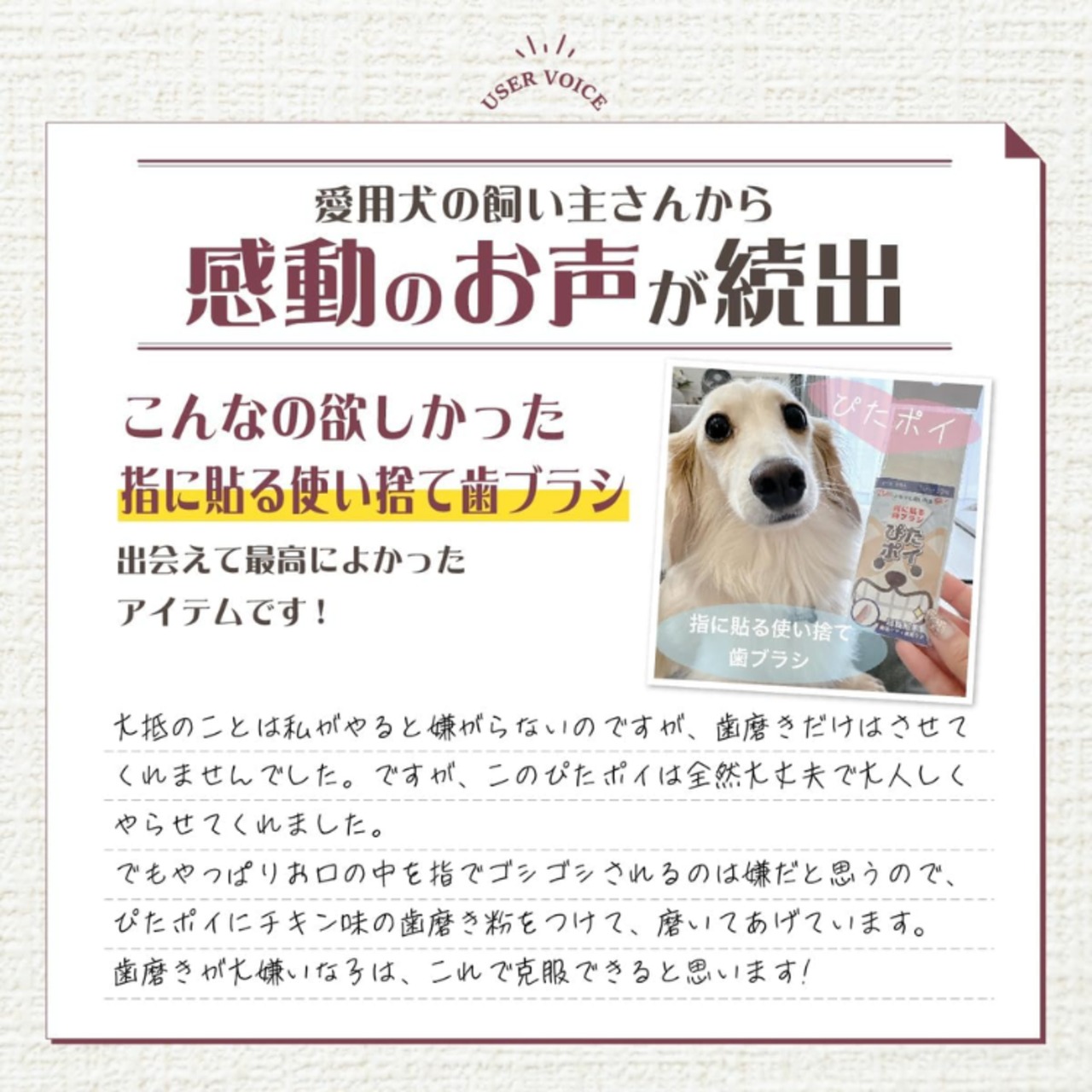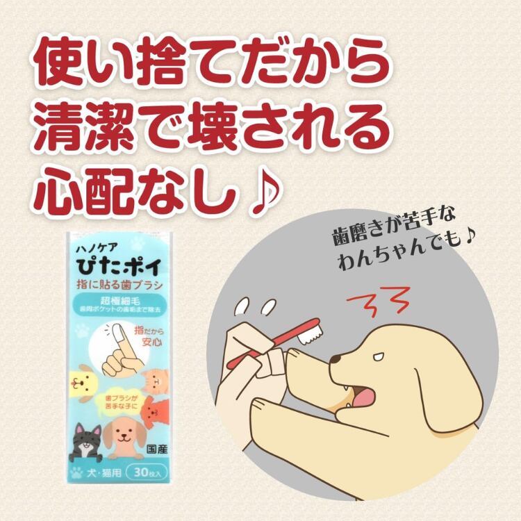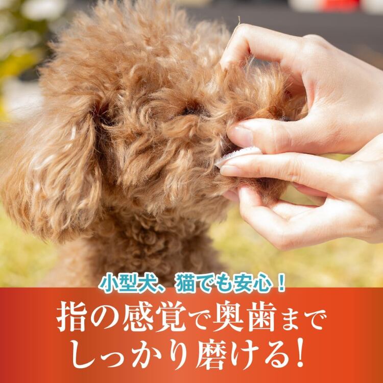 指にぴたっと貼りつくので、指サックや歯ブラシと違い、飼い主様の指の感覚で歯の裏側や奥歯までしっかり歯磨きできます。飼い主様の指なので愛犬、愛猫も安心でリラックスしてケアできます。
