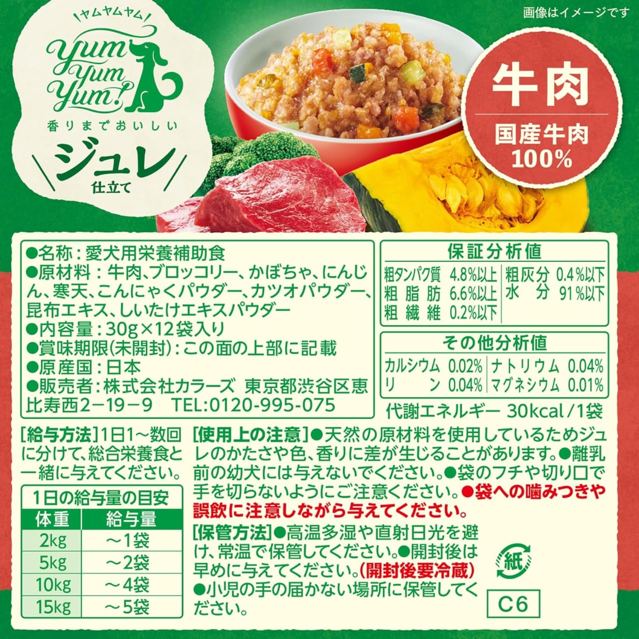 主原料には国産牛肉をたっぷり使用。 ブロッコリー、かぼちゃ、にんじんなどの野菜もたっぷりです。袋を開けた瞬間に広がる香りで、食欲をしっかり刺激し、食いつきの良さも自慢の一品です。