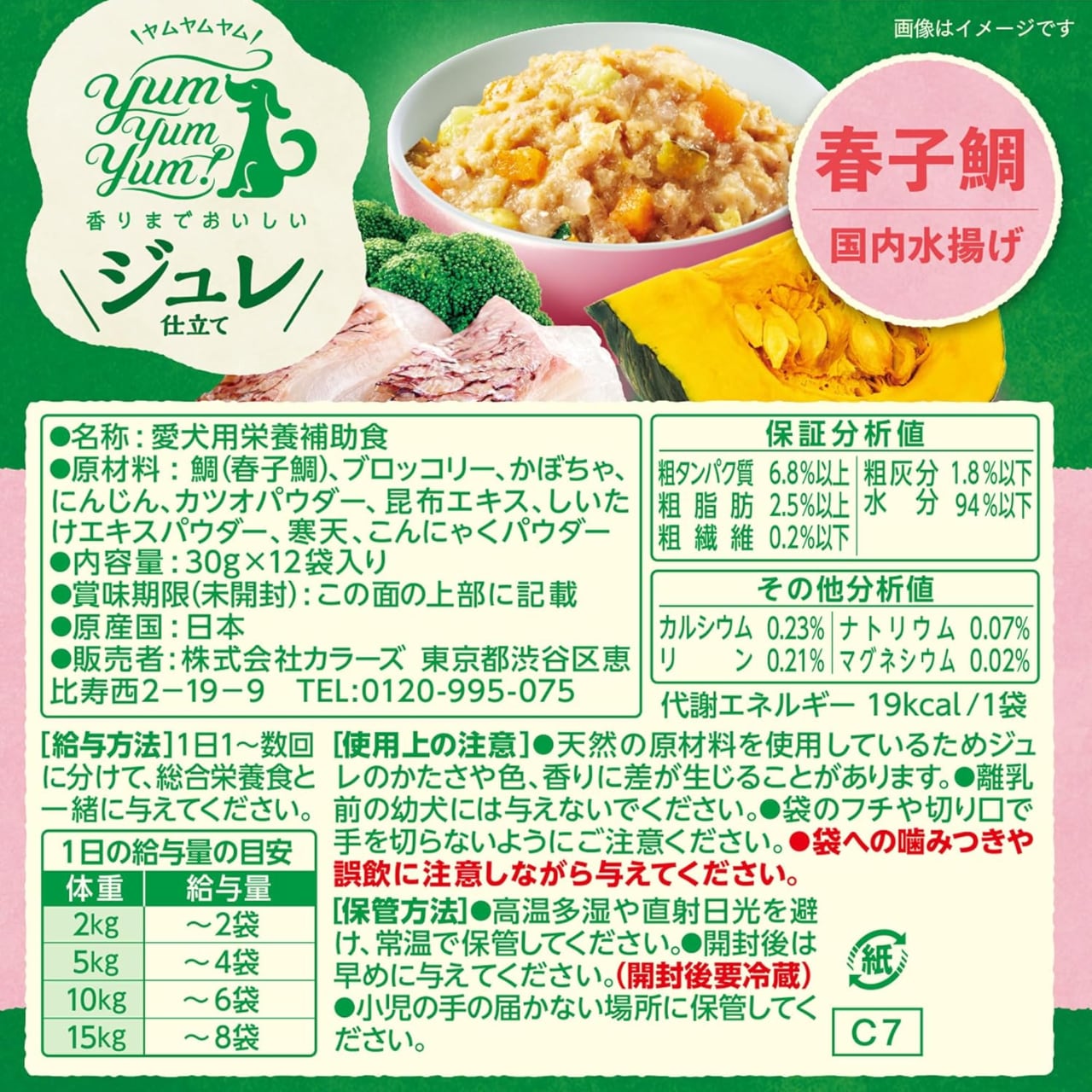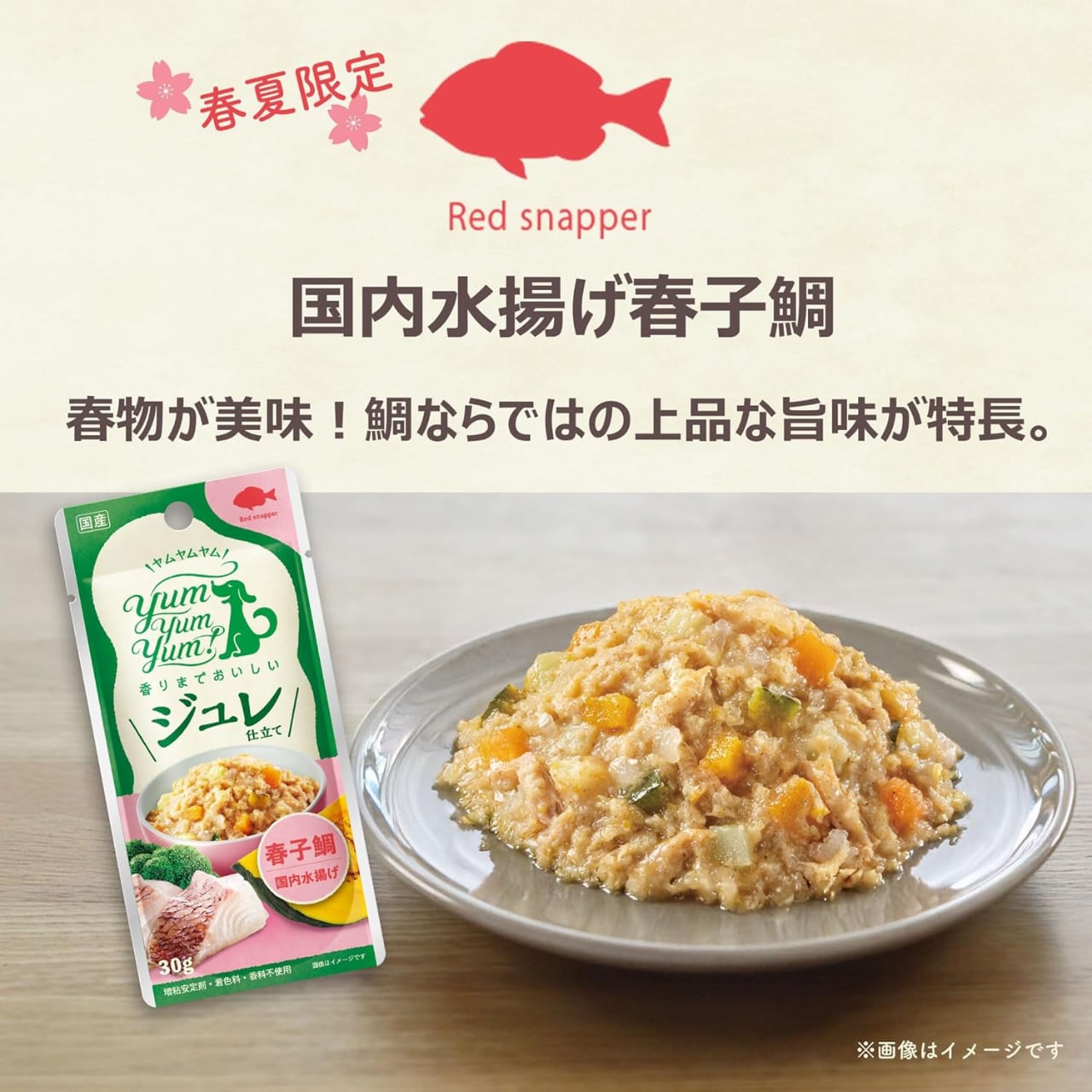 主原料には3~4月が旬な春子鯛を使用。 春子鯛はマダイやチダイの稚魚(手のひらサイズ)の総称で、桜色の皮目と柔らかくしっとりとした身が特徴です。そんな春子鯛のおいしさを骨ごと・皮ごと詰め込みました。さらに、yum yum yumの特徴である、かつお節・しいたけ・昆布の合わせだしで風味豊かに仕上げました。