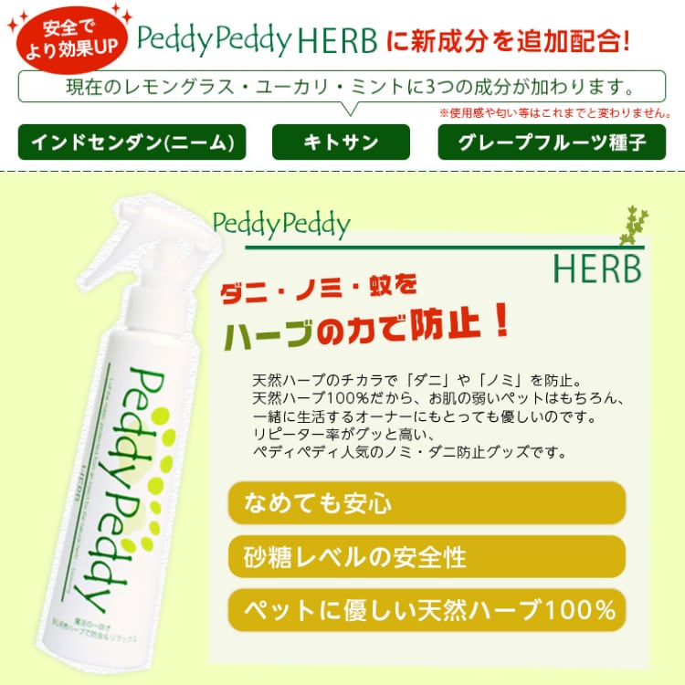 ペディペディハーブは当社独自の経験と技術で厳選した天然ハーブ数種類を使用し、犬や猫などペットの体に寄生するダニやノミ、蚊のような害虫から身を守る忌避効果を最大限にあげました。害虫からの病気の感染を防ぎ、ペットが快適に過ごせます。