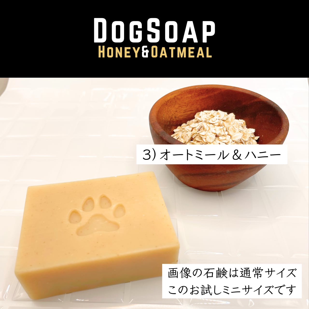 3)は内容が変わり、アトピー・痒み、保湿に特化したオートミールとハチミツの石鹸です